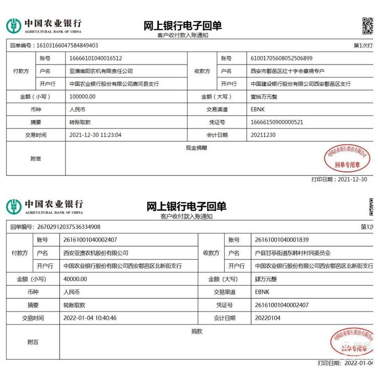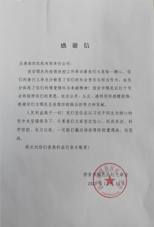 十二月份,一場突如其來的疫情打亂了西安人平靜的生活,面對日趨嚴峻的疫情態(tài)勢,亞澳農機作為一家有社會責任感的企業(yè)積極奉獻自己力量,亞澳農機南陽公司為鄠邑區(qū)紅十字會捐款100000元,亞澳農機總公司為鄠邑區(qū)甘亭街道東韓村捐款40000元,亞澳農機與社會各界人士并肩作戰(zhàn),為疫情防控工作貢獻自己的一份薄力。