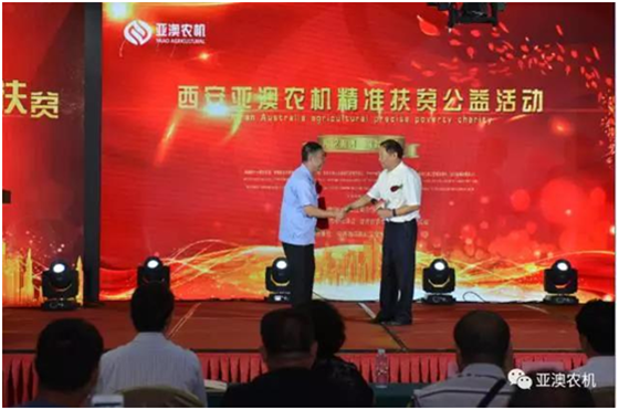 亞澳精準扶貧公益活動現場,中國農機化協會會長劉憲到會致辭,并給予亞澳頒發(fā)證書。