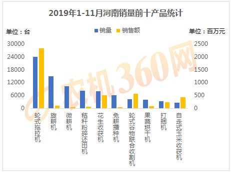 2019年1-11月,上榜河南用戶購(gòu)機(jī)量前十的農(nóng)機(jī)產(chǎn)品如下圖所示,輪式拖拉機(jī)、旋耕機(jī)、微耕機(jī)等10種農(nóng)機(jī)合計(jì)購(gòu)買力接近8.5萬臺(tái),占了河南農(nóng)機(jī)總銷量的約80%,對(duì)這10類農(nóng)機(jī)的購(gòu)機(jī)支出達(dá)43.3億元。