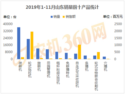 2019年1-11月,上榜山東用戶購(gòu)機(jī)量前十的農(nóng)機(jī)產(chǎn)品如下圖所示,微耕機(jī)、輪式拖拉機(jī)、旋耕機(jī)等10種農(nóng)機(jī)合計(jì)購(gòu)買力11.5萬多臺(tái),是山東農(nóng)機(jī)總銷量的86.54%,對(duì)這10類農(nóng)機(jī)的購(gòu)機(jī)支出達(dá)38.55億元。