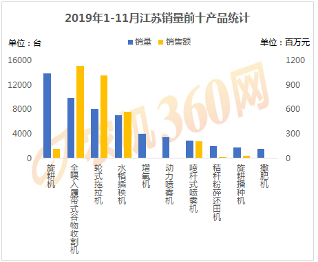 2019年1-11月,上榜江蘇用戶購(gòu)機(jī)量前十的農(nóng)機(jī)產(chǎn)品如下圖所示,旋耕機(jī)、全喂入履帶式谷物收、輪式拖拉機(jī)等10種農(nóng)機(jī)合計(jì)購(gòu)買力5.45萬臺(tái),是江蘇農(nóng)機(jī)銷量的85.35%,對(duì)這10類農(nóng)機(jī)的購(gòu)機(jī)支出達(dá)31.02億元。