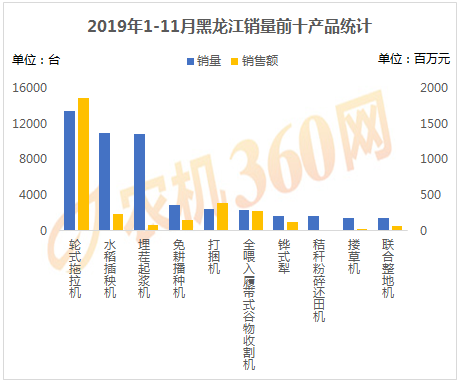 2019年1-11月,上榜黑龍江用戶購(gòu)機(jī)量前十的農(nóng)機(jī)產(chǎn)品如下圖所示,輪式拖拉機(jī)、水稻插秧機(jī)、埋茬起漿機(jī)等10種農(nóng)機(jī)合計(jì)購(gòu)買力4.9萬臺(tái),是黑龍江農(nóng)機(jī)銷量的93.09%,對(duì)這10類農(nóng)機(jī)的購(gòu)機(jī)支出達(dá)32.23億元。