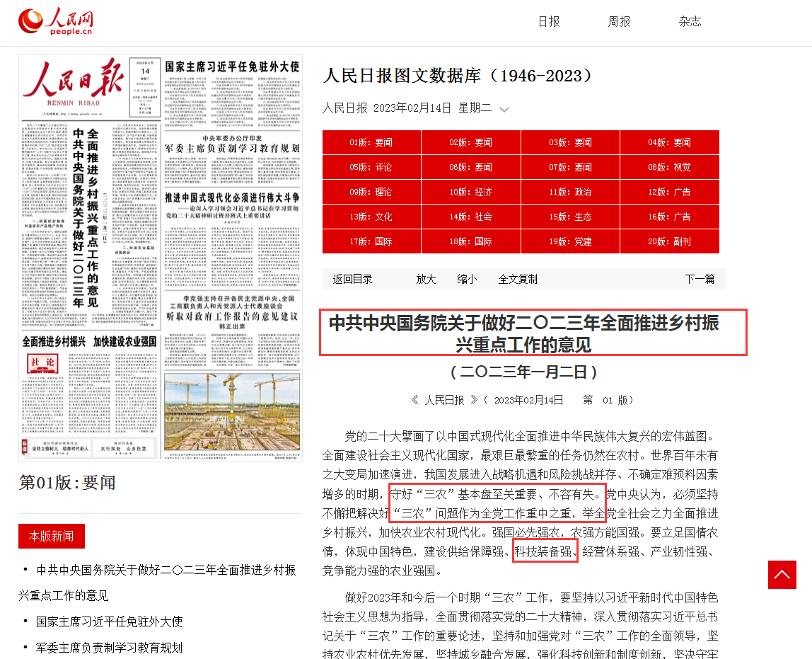 2023年中央一號(hào)文件2月13日正式發(fā)布。文件提出,要立足國(guó)情農(nóng)情,體現(xiàn)中國(guó)特色,建設(shè)供給保障強(qiáng)、科技裝備強(qiáng)、經(jīng)營(yíng)體系強(qiáng)、產(chǎn)業(yè)韌性強(qiáng)、競(jìng)爭(zhēng)能力強(qiáng)的農(nóng)業(yè)強(qiáng)國(guó)。